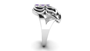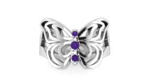 We created this Amethyst Butterfly Ring as a promise ring. However, it can easily be worn as a right hand ring if you just happen to love butterflies. And if you have another wing pattern you would like, we could do that for you as well as long as it fits. We have 3 amethyst on the body, but these could be any type of stone or even be removed. The cutout wings gracefully flutter towards an elegantly splitting shank.