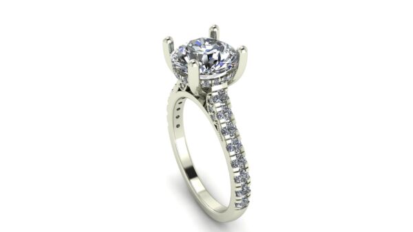When you think of Cathedral Peekaboo Engagement Ring designs, you typically think of a single stone underneath the center stone. Here, we put the peekaboo stones on the shoulders instead. This way we could add more than 1 stone. This ring is what is called a semi mount. It will fit any size or shape center stone. Our customer had a specific head in mind for the ring and so we created the ring and will just solder his head onto the ring. Other than that, this your typical shared prong engagement ring. And we have shown it with an optional band. The stones in the band are 2mm, but other sizes could be used.