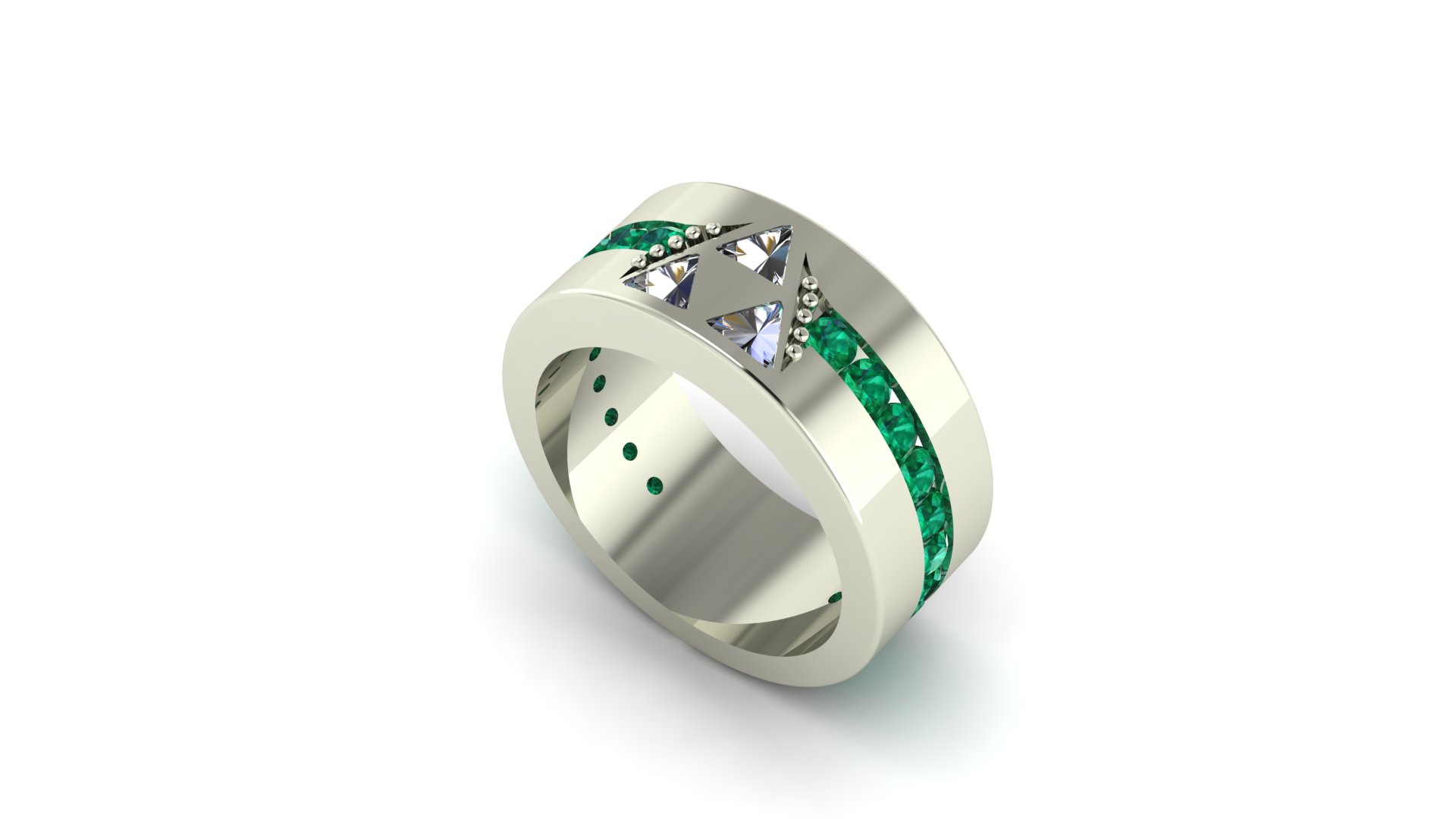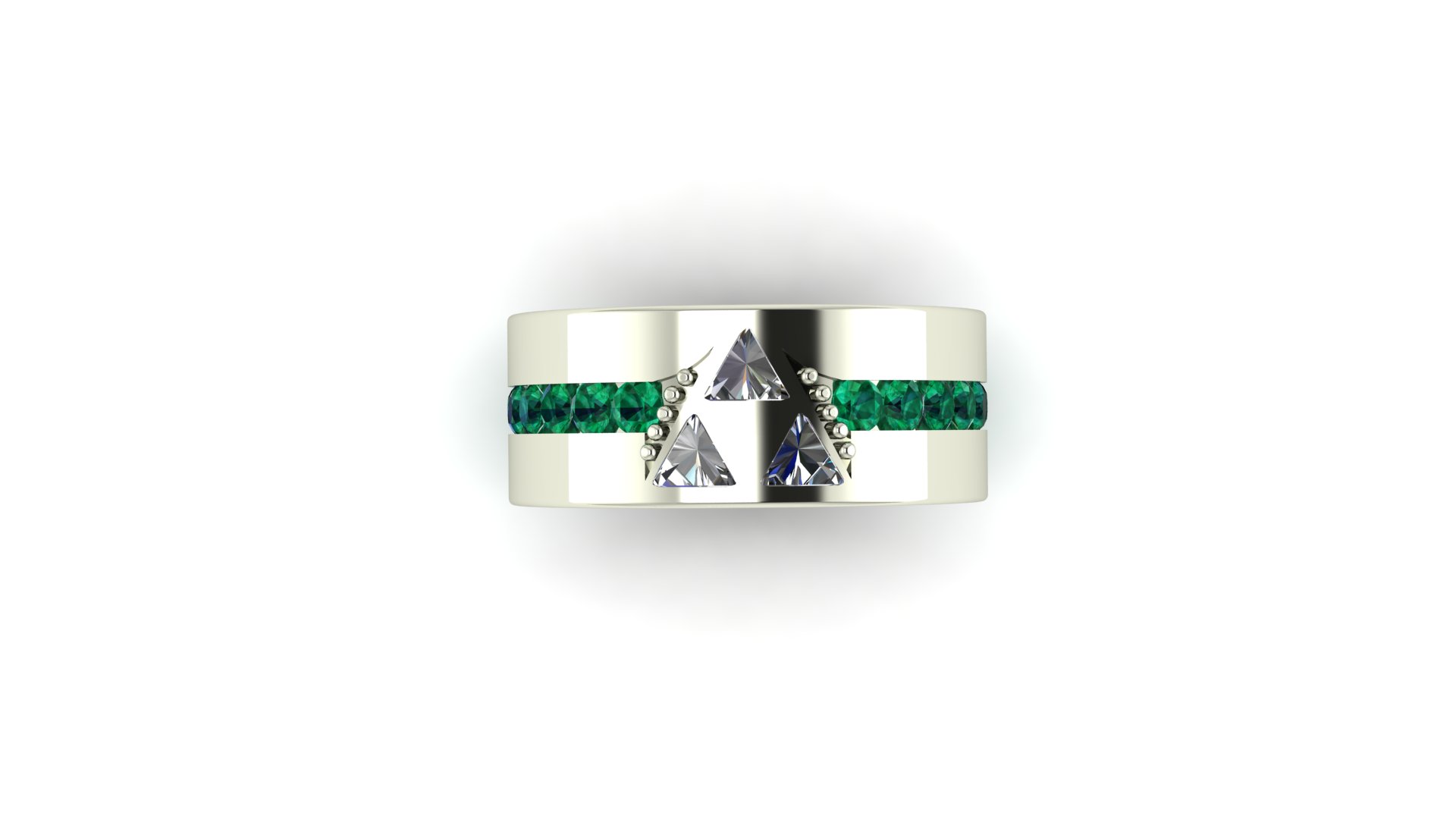 This is our latest Legend Of Zelda Wedding Ring. We start with 3 triangle stones to form the triforce in the center. Then we have channel set emeralds going around the band. This one was 8mm wide, which it could be made narrower depending on the type of stone. These were moissanite, and they aren’t cut smaller than that. However, other stones might be available.